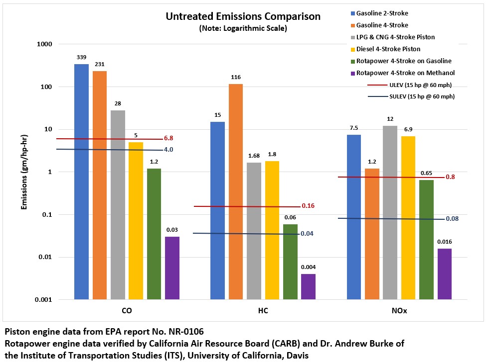 Air pollution is a worldwide problem and the development of an ultra-clean burning fuel and engine combination has been the goal of many scientists and engineers for many decades. RotaPower LLC has what it believes to be a great solution using an engine first conceived by Dr. Felix Wankel, and ethanol fuel (non-fossil fuel made from organic materials).Tests carried out in conjunction with the Institute of Transportation Studies (ITS) at the University of California at Davis, and witnessed by members of the California Air Resources Board (CARB), saw the Rotapower® engine using gasoline as a fuel achieve hydrocarbon, carbon monoxide, and nitrous oxide emission levels well below those required to meet the Ultra Low Emission Vehicle (ULEV) standards for California. This was accomplished without exhaust after-treatment (catalytic converter) which had not been previously achieved with any other engine technology.