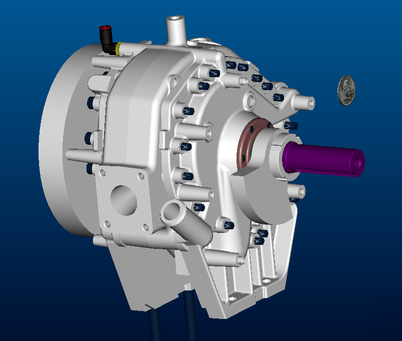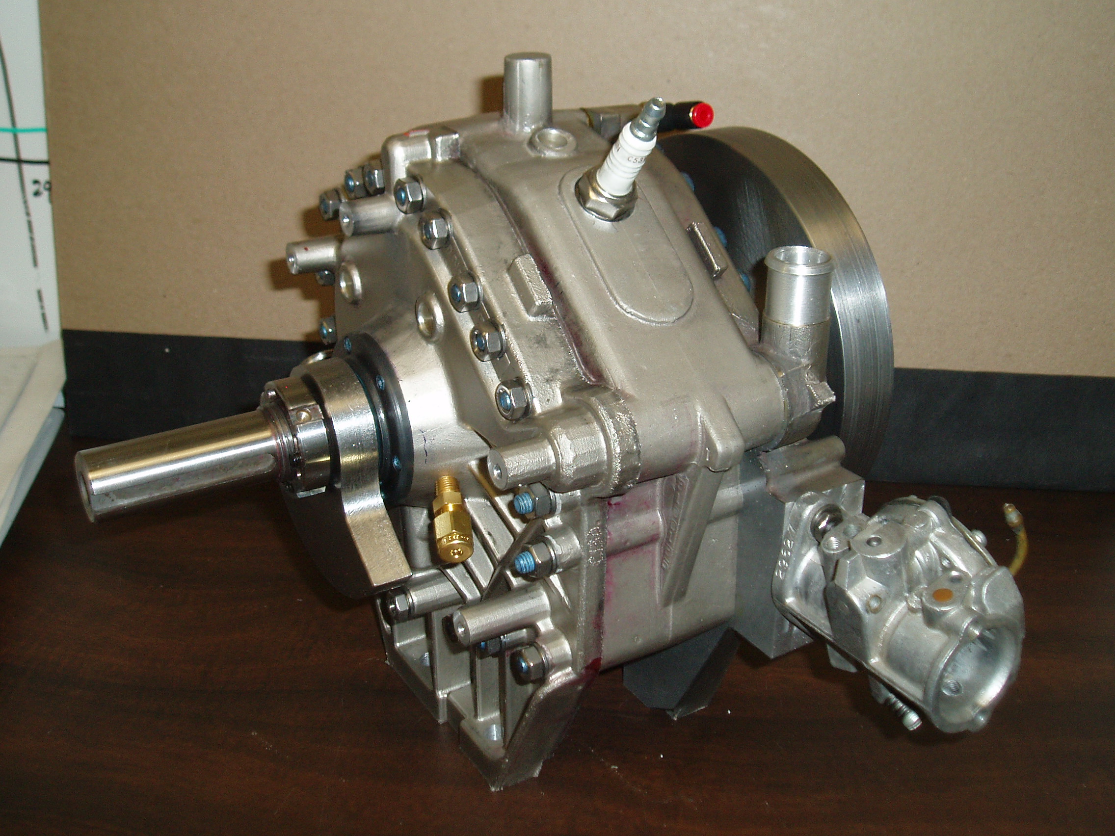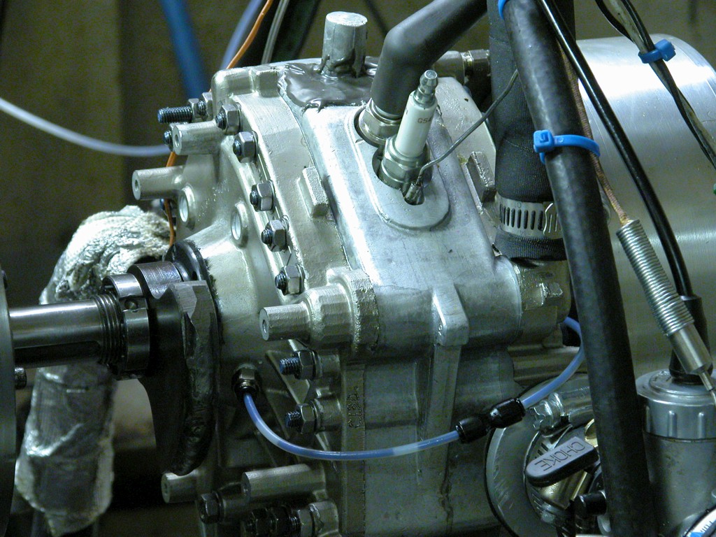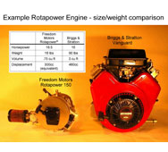 The Rotapower® 150cc is a newly designed rotary engine capable of 20 hp on gasoline. Although not in production at this time, the prototypes of this engine have been tested in several applications and is currently being evaluated in a motor-generator set. This light weight and powerful new rotary engine is based on the Rotapower® 650cc design and can be produced in both single and twin-rotor configurations, using either liquid (as shown) or air-cooled housings. The output of this engine makes it ideal for a number of applications requiring a compact, light weight, 4-stroke, emissions friendly engine.The Rotapower® 150cc engine was beta produced in 2008.